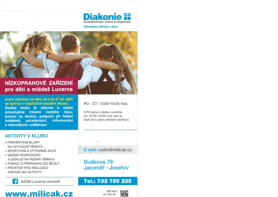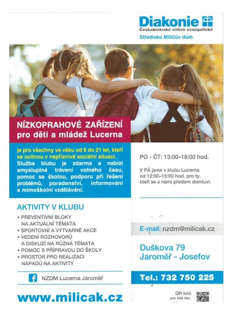 Nízkoprahové zařízení pro děti a mládež NZDM Lucerna poskytuje zázemí, pomoc a podporu dětem a dospívajícím v obtížných životních situacích. Pomáháme jim smysluplně trávit volný čas. Motivujeme a podporujeme děti a dospívající k aktivnímu přístupu k životu, k řešení situací, se kterými si neví rady. Jedná se o ambulantí a terénní službu, což znamená, že děti a mládež mohou docházet do klubu v Jaroměři, který se nachází v ulici Duškova 79 (Josefov), nebo se mohou setkat s pracovníkem v terénu-okolí Jaroměře a Josefova.