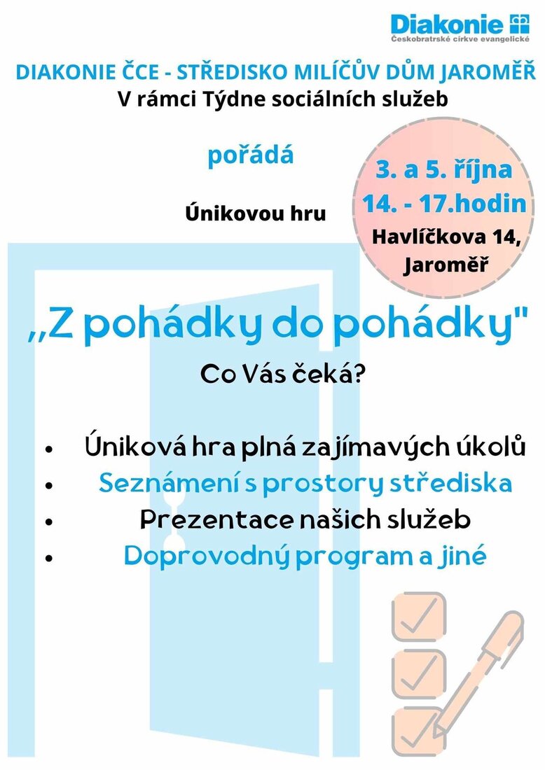 úterý a ve čtvrtek si u nás na středisku můžete vyzkoušet zahrát ÚNIKOVKU! Hru jsme si pro Vás připravili v rámci dne otevřených dveří, přijďte si užít zábavu a seznámit se s naším střediskem, budeme se na všechny moc těšit :)