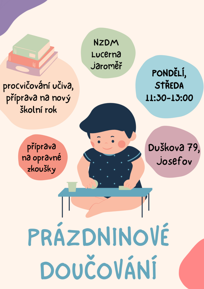 I během prázdnin bude na klubu Lucerna probíhat doučování. Pomůžeme dětem s přípravou na opravné zkoušky či jen tak procvičovat učivo, aby byl pro ně návrat do školních lavic snazší. Doučování je ZDARMA a probíhá každe PONDĚLÍ a STŘEDU od 11:30-13:00 v prostorách klubu (Duškova 79, Josefov).
