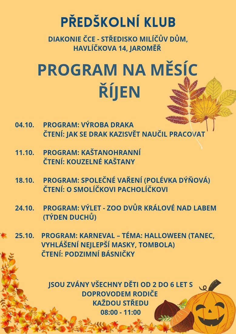 Program akcí předškolního klubu na měsíc ŘÍJEN. Těšíme se na Vás :)