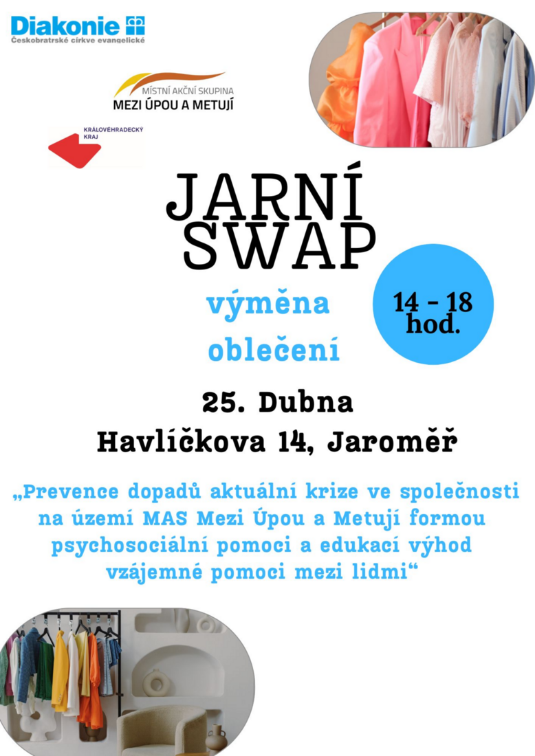 V úterý 25. dubna od 14 do 18 hod můžete přijít na výměnu jarního oblečení - můžete přinést, odnést dle potřeby. Oblečení dětské, dámské či pánské, obuv - čisté, bez flíčků…prostě takové, které by jste s klidným srdcem věnovali blízkému…